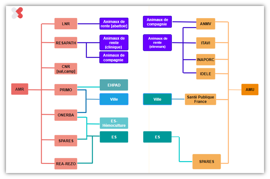 En rouge, les dispositifs collectant des données de résistance (AMR). En orange, les dispositifs collectant des données de consommation (AMU). Au centre sont indiqués les secteurs pour lesquels chaque dispositif collecte des données. La santé animale est figurée en violet et la santé humaine en bleu/vert. Abréviations utilisées : CNR = Centre National de Référence ; sal. = salmonelles ; camp. = campylobacter ; EHPAD = Établissement d’hébergement pour personnes âgées dépendantes ; ES = Etablissement de santé.